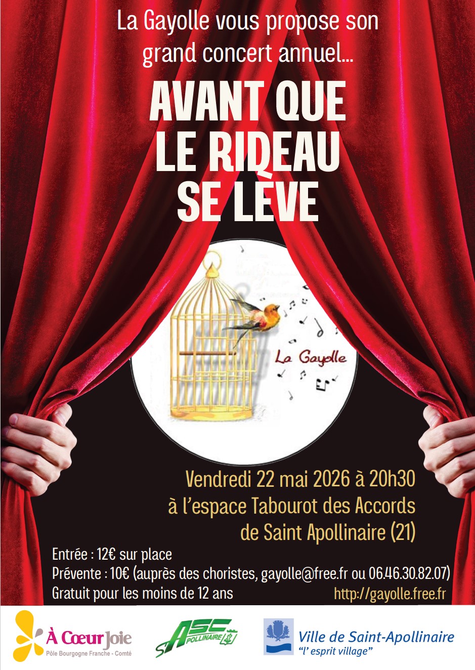 Concert annuel de la Gayolle Gérald Catégorie : Actualités 20 Avril 2026 Clics : 18 Rating: ( 0 Notation ) Veuillez voter Vote 1 Vote 2 Vote 3 Vote 4 Vote 5 Le vendredi 22 Mai 2026 à l'Espace tabourots des Accords Suivant